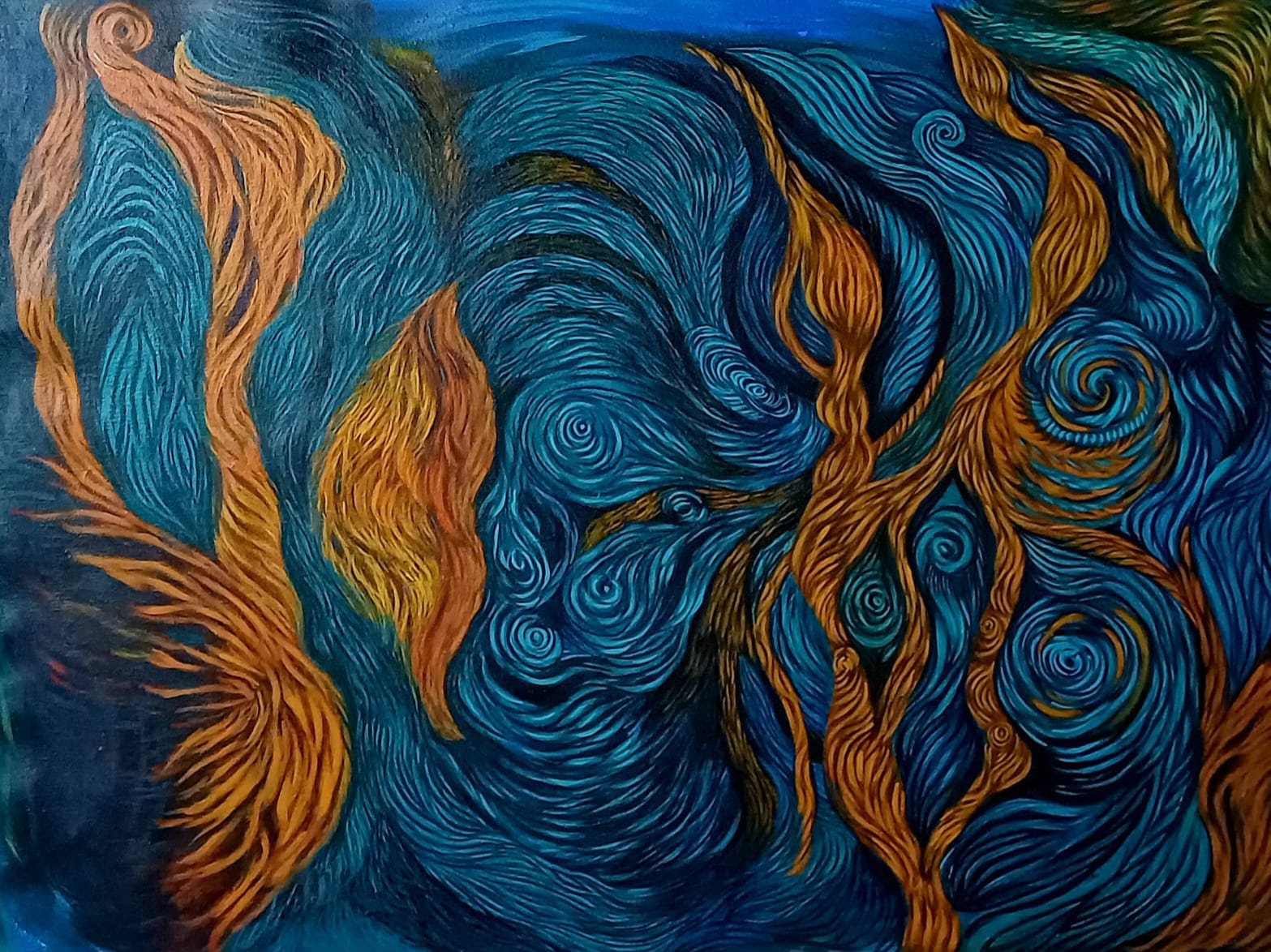 Immerse your space in the dynamic beauty of nature with this captivating abstract art print. This artwork features a mesmerizing interplay of deep ocean blues and vibrant, earthy oranges, creating a sense of organic movement and depth. Swirling lines in various shades of blue evoke the powerful currents and intricate textures of underwater environments or atmospheric phenomena. Interspersed within these flows are abstract botanical or biological forms, rendered in warm, rust-like oranges and browns, suggesting kelp, coral, or perhaps even ethereal flames.