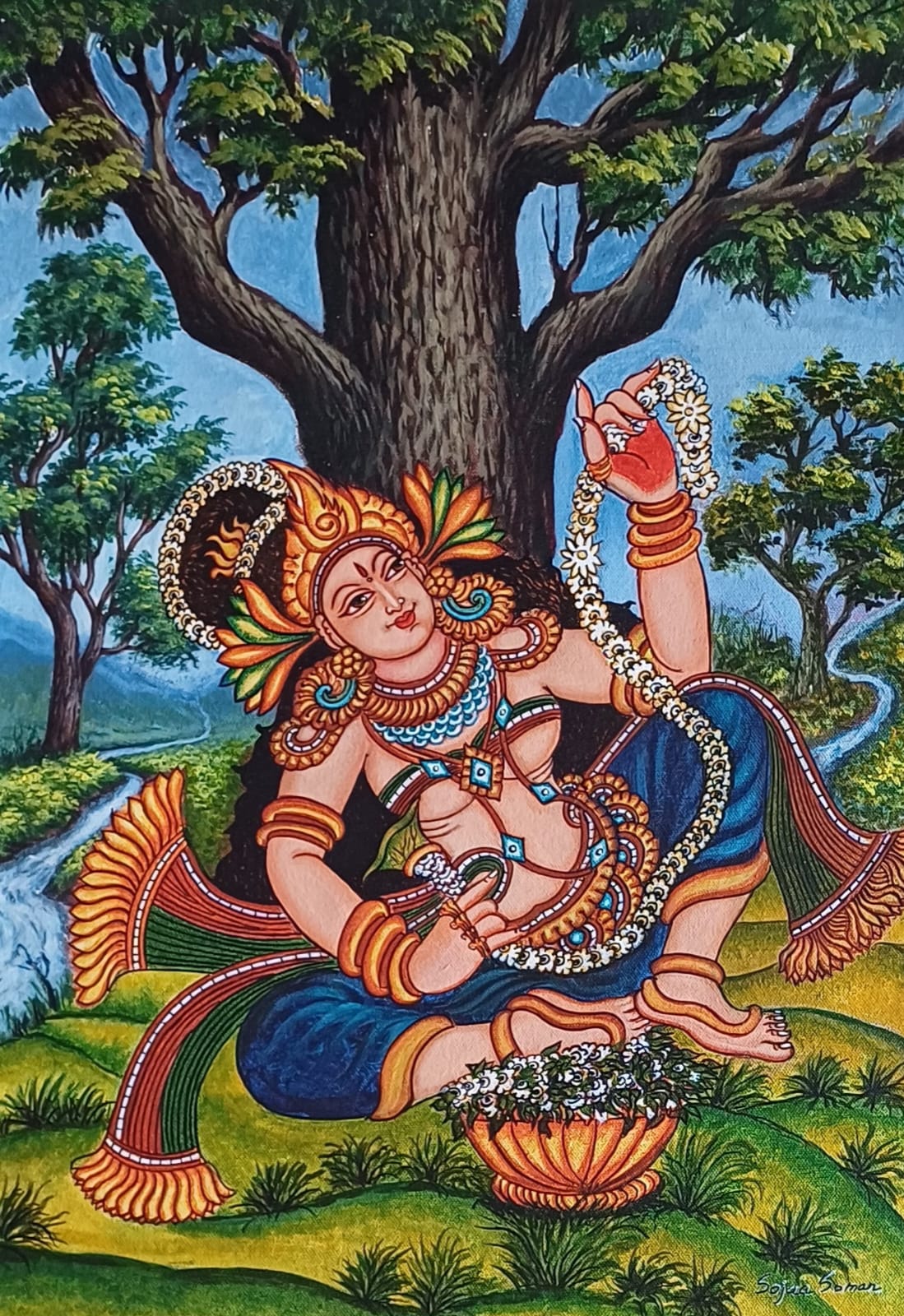 This beautiful handmade Kerala mural painting depicts Lord Krishna seated under a tree, gracefully holding a flower garland. The vibrant colors, intricate details, and flowing natural background bring a divine and serene touch to the artwork.