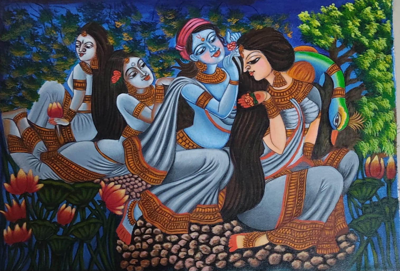 Bring the divine and enchanting story of Krishna to your home with this beautiful art print. This traditional Indian painting, created in the classic style of Indian mythological art, depicts Lord Krishna surrounded by the gopis (cowherd women) in a serene forest setting.
